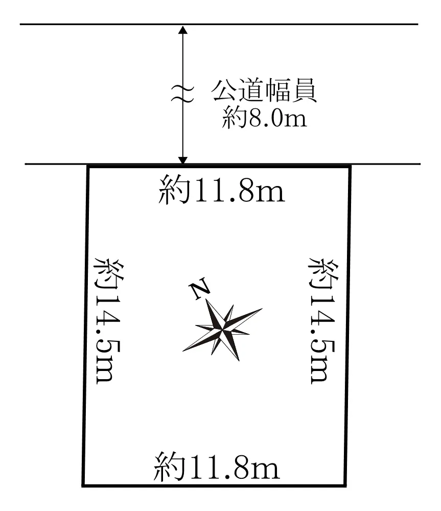 本物件は、敷地面積171.98u(52.02坪)、前面道路は北東側約8.0m、間口が約11.8mとなります。