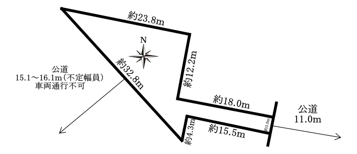 南西側公道(車両通行不可)15.1〜16.1m(不定幅員)