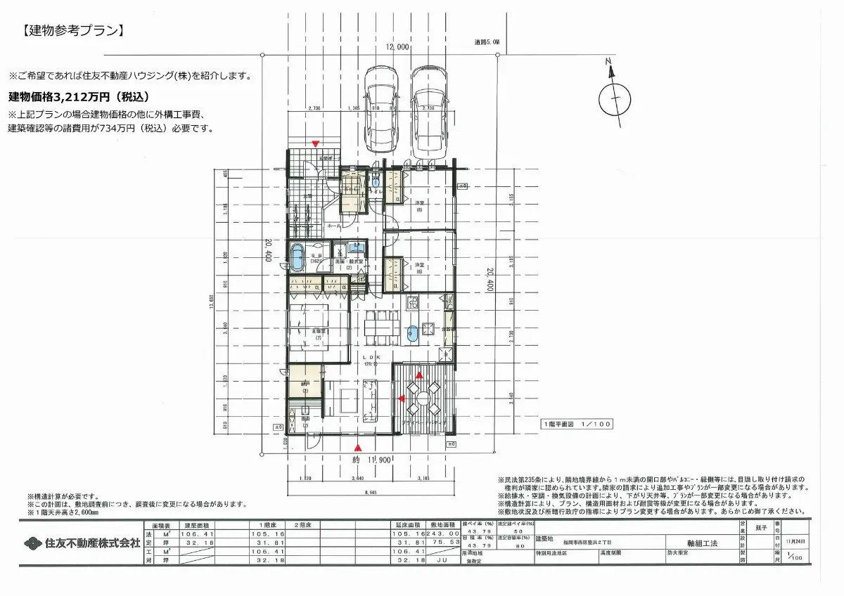 | 接道状況 | 一方道路・北5m(公道)接面12m |