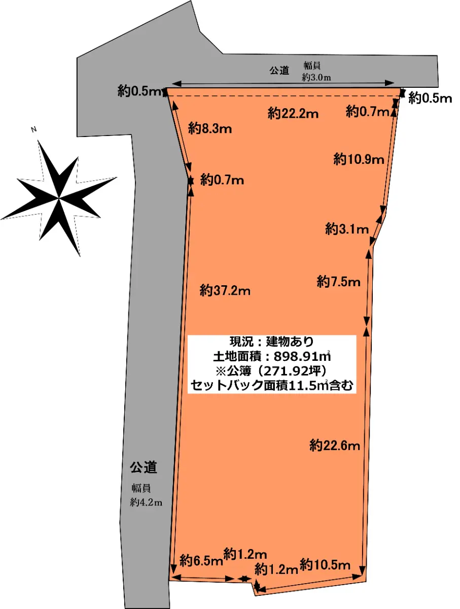 | 土地面積 | 898.91m2(約271.92坪)※公簿/セットバック:11.50m2含む |