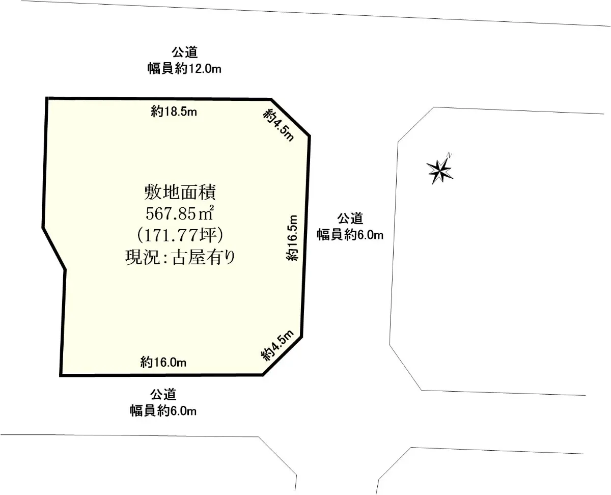 | 接道状況 | 三方道路・北西12m(公道)接面18.5m/北東6m(公道)接面16.5m/南東6m(公道)接面16m |
