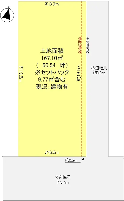 | 土地面積 | 167.10m2(約50.54坪)※実測/セットバック:9.77m2含む |