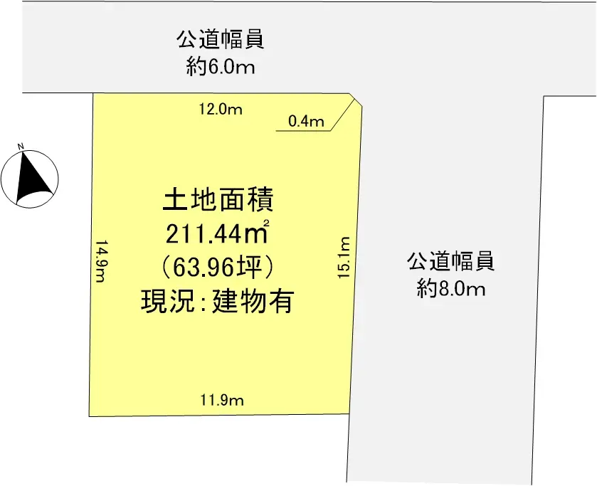 | 接道状況 | 角地・北6m(公道)接面12m/東8m(公道)接面15.1m |