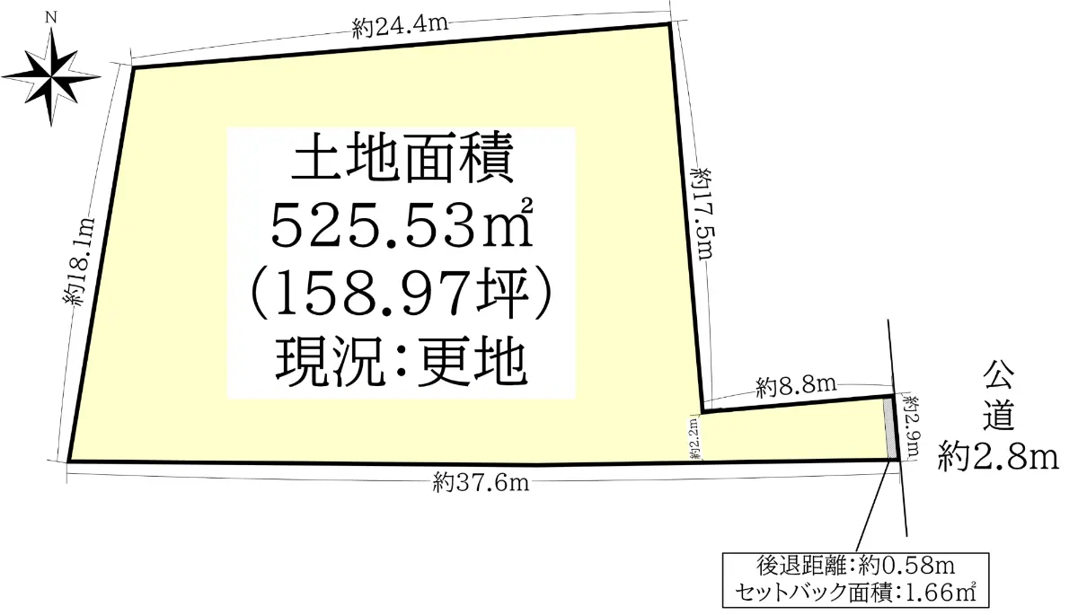 | 土地面積 | 525.53m2(約158.97坪)※公簿/セットバック:1.66m2含む/路地状部分:21.29m2含む |