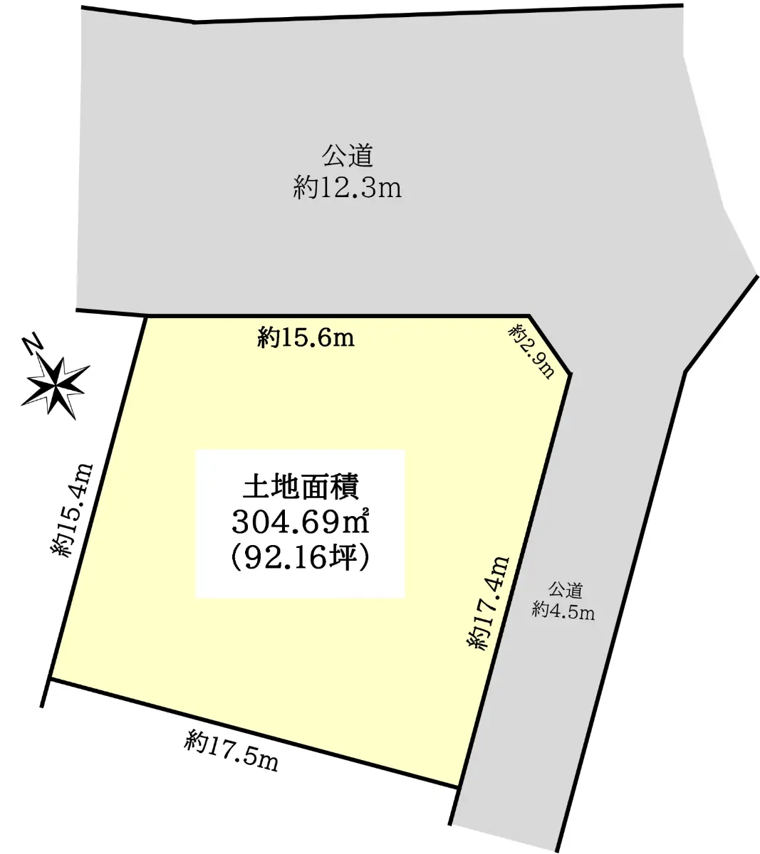 | 接道状況 | 二方道路・北東12.3m(公道)接面15.6m/南東4.5m(公道)接面17.4m |