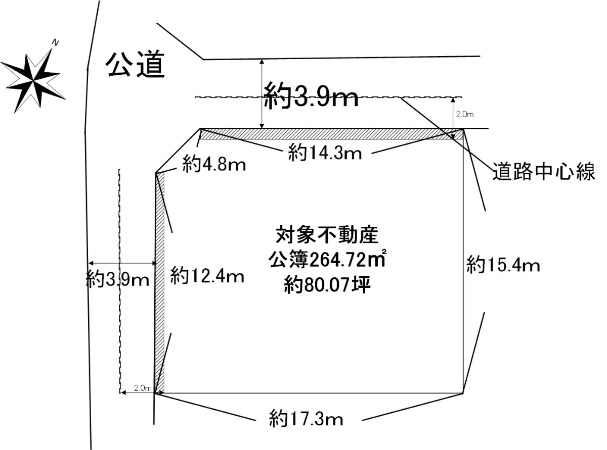 | 接道状況 | 角地・北西3.9m(公道)接面14.3m/南西3.9m(公道)接面12.4m |