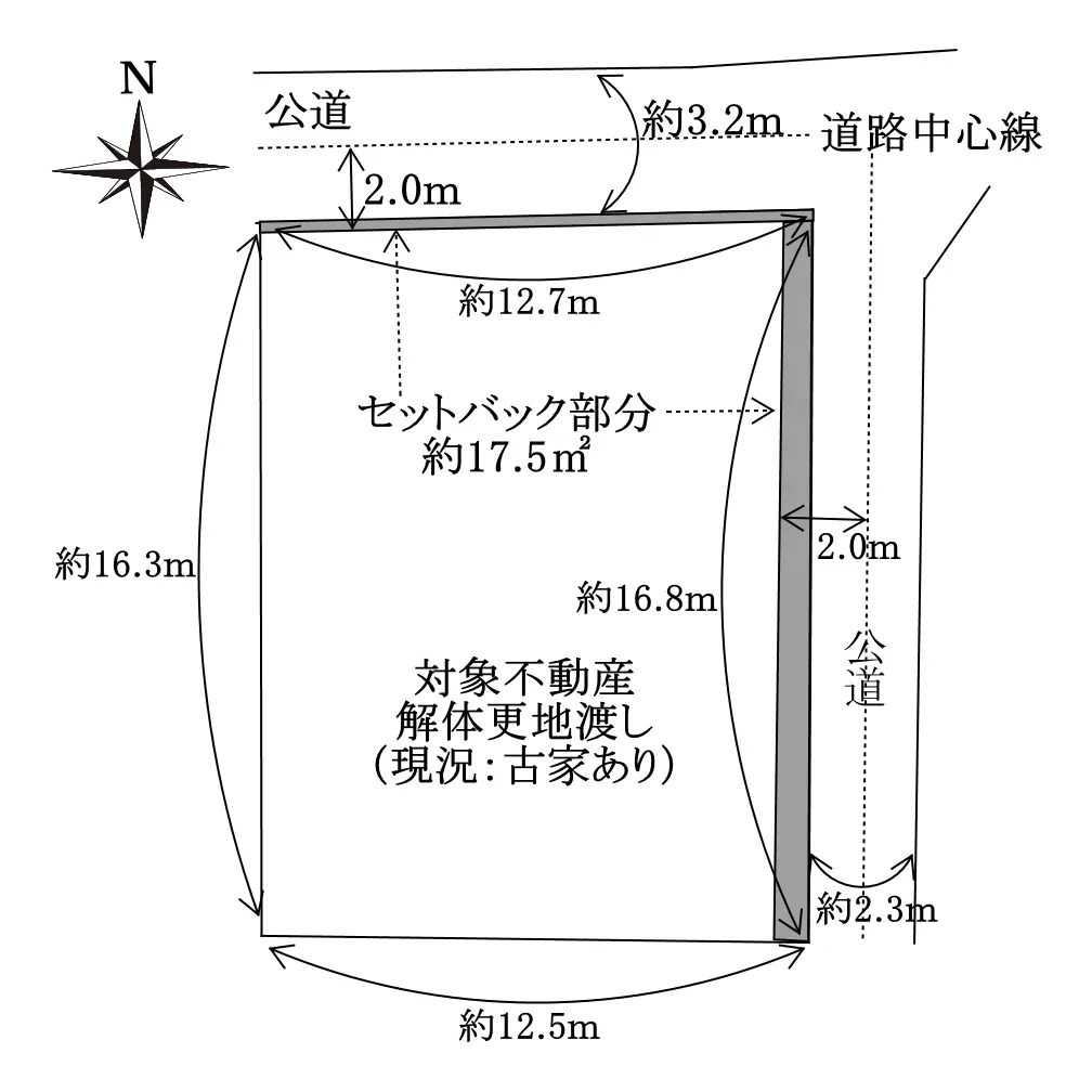 | 接道状況 | 角地・北3.2m(公道)接面12.7m/東2.3m(公道)接面16.8m |