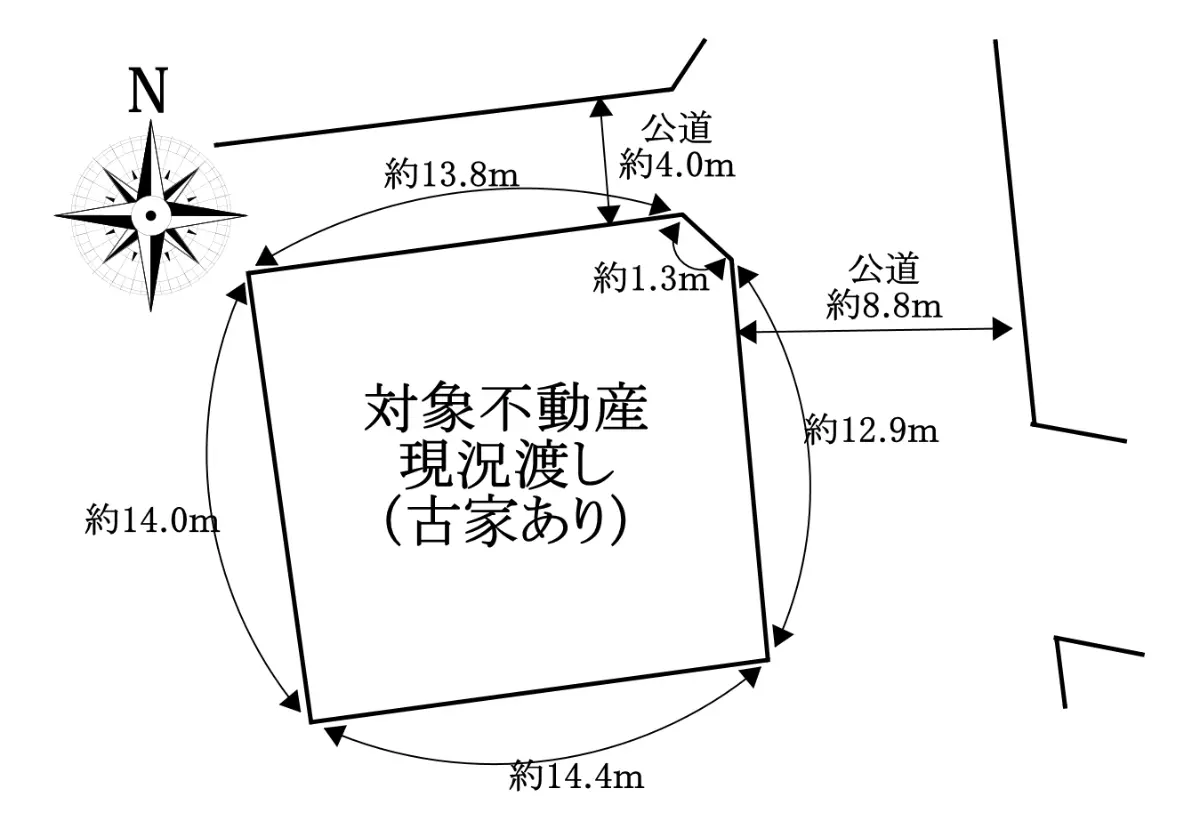 | 接道状況 | 角地・北4m(公道)接面13.8m/東8.8m(公道)接面12.9m |