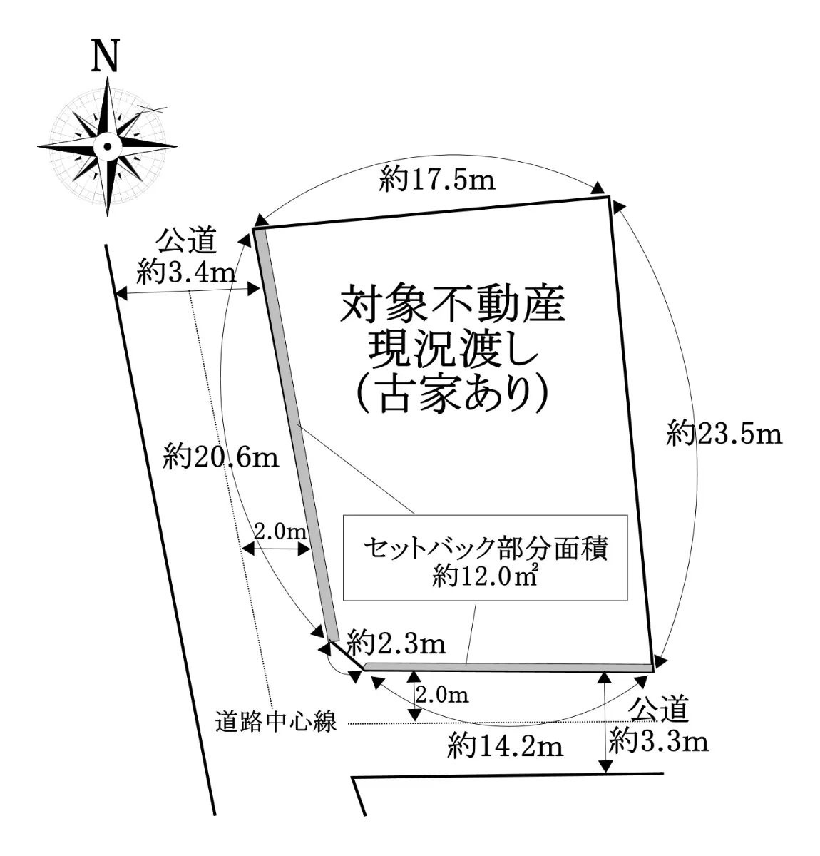 | 接道状況 | 角地・西3.4m(公道)接面20.6m/南3.3m(公道)接面14.2m |