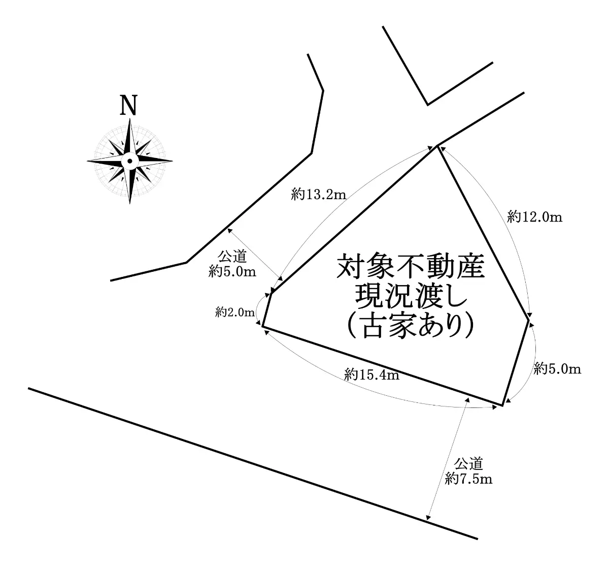 | 接道状況 | 二方道路・南西7.5m(公道)接面15.4m/北西5m(公道)接面13.2m |