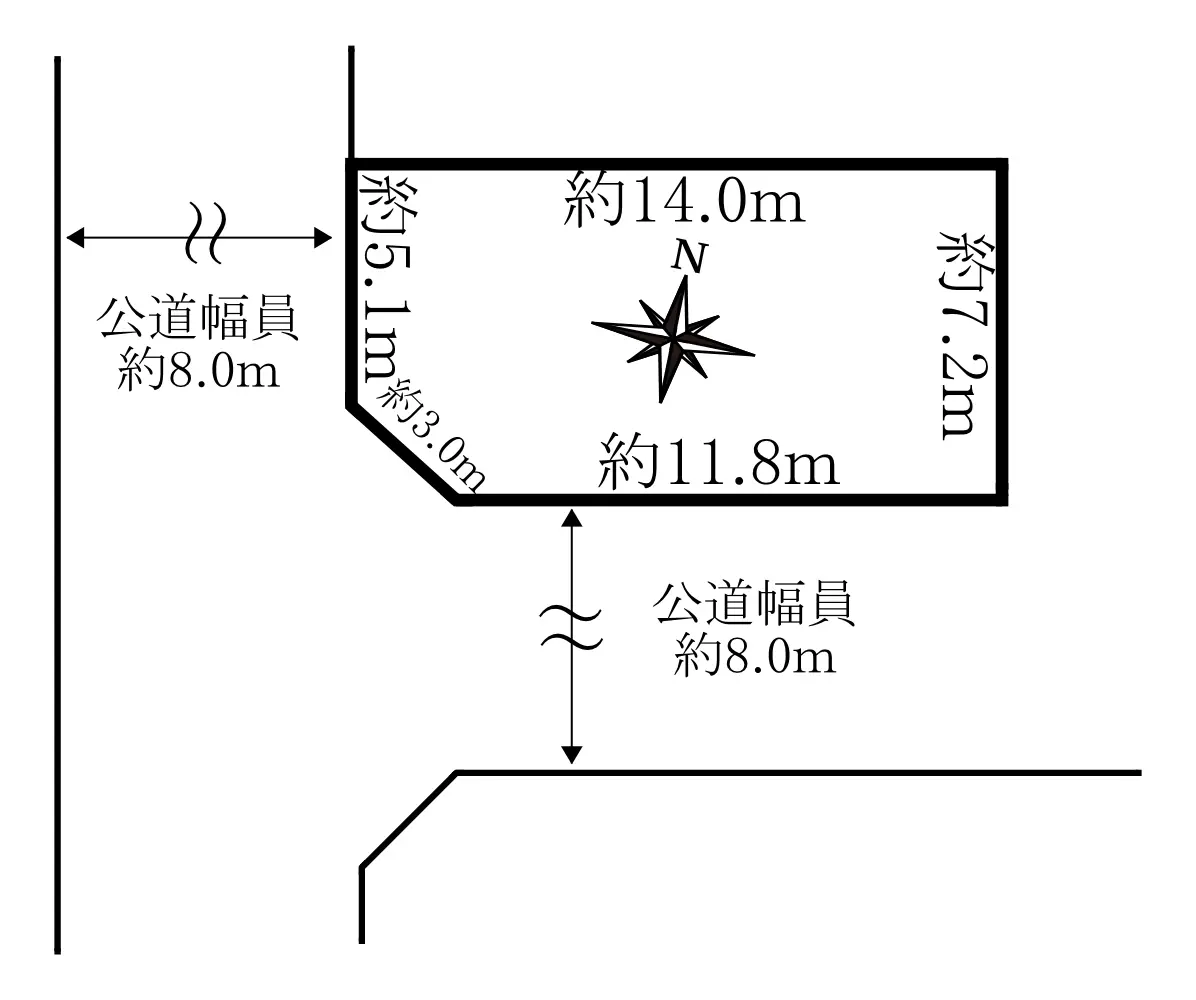 | 接道状況 | 二方道路・西8m(公道)接面5.1m/南8m(公道)接面11.8m |
