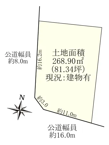 ・西側:公道 幅員約8.0m、間口約16.2m