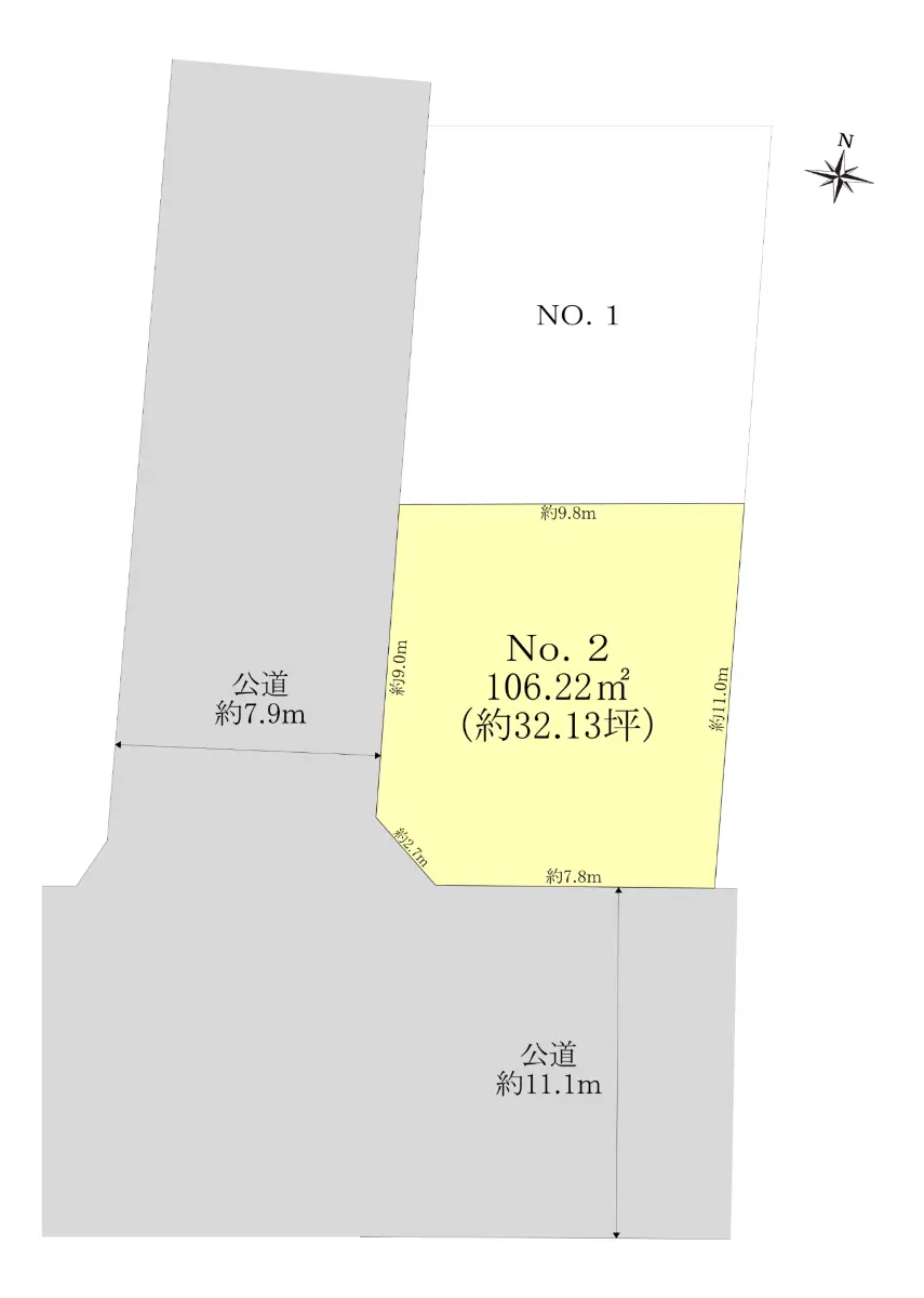 | 接道状況 | 二方道路・南11.1m(公道)接面7.8m/西7.9m(公道)接面9m |